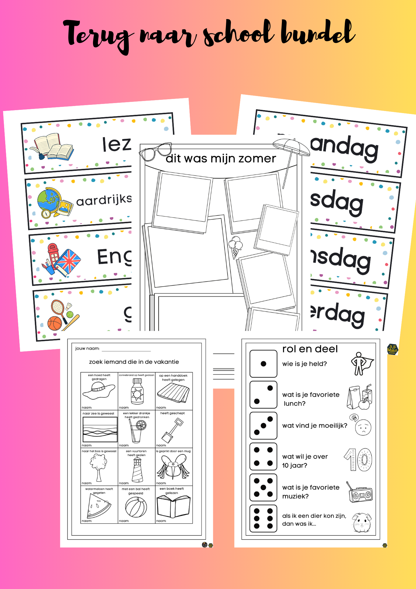 Zowel het gouden weken lespakket als de terug naar school bundel zijn geschikt voor alle groepen van de basisschool. Ik heb het zo geschreven en gemaakt dat het voor alle leeftijden kan, er staan veel afbeeldingen in bij de spellen, dus niet overal is het lezen nodig. En door de verschillende afbeeldingen is het ook geschikt voor de bovenbouw. Wil je echt alleen voor de onderbouw? Dan kun je ook kijken naar het Eerste schoolweken lespakket kleuters.